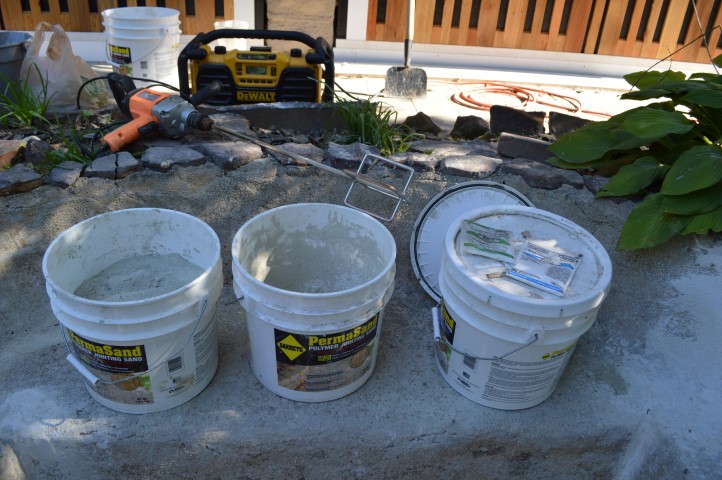 I mixed using a Low-Speed Mixer, fitted with a cement/mortar mixing paddle. Recycled 5-gallon tubs (from the polymeric sand used in our patio install) worked great as the containers for both mixing and applying.