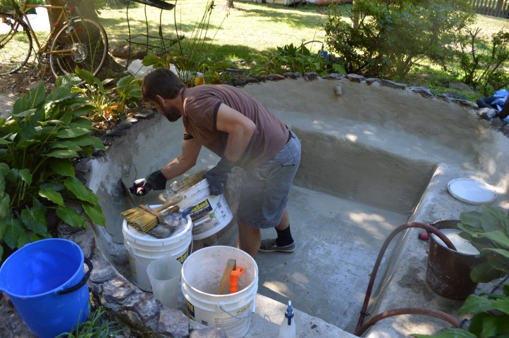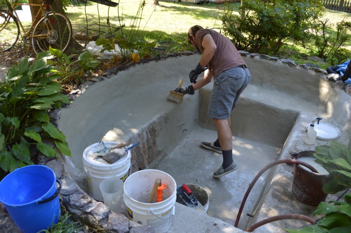 With this mix working so well, I even began forgoing the trowel and just started brushing my slurry on. I ultimately brushed all the pond’s vertical surfaces. Starting at the bottom and working my way up – I made sure to give myself an escape plan.